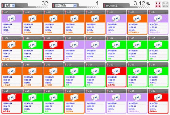 显示所有机器当前的状态(以不同颜色区分),以及该状态的开始时间,该状态持续的时间。及其他相关统计数据。点击相应机器图标可修改机器当前状态。